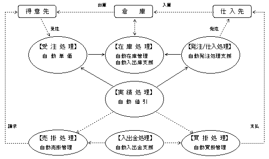 販売管理システムとしては受注が決定すればそのデータを利用し、仕入れを自動的に行うことができます。社内の部門ごとに業務を行うのではなく、発注〜入出庫処理〜在庫管理までを一貫して自動処理することを基本コンセプトとしています。これはコンピュータを最大限に使い、人間の労力は最少で済ませるためにです。