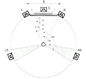5.1チャンネルサラウンド方式とは、リスナーの前方中央(C)、前方左右(L、R)、後方左右(LS、RS)の計5チャンネルのスピーカと低域用のサブウーファー(0.1チャンネルとカウントする)によって立体音響を再生する方式である。下図に示すようなスピーカのレイアウトにより、左右の定位に加えて前後の定位も再現することが可能となり、前後左右の音の拡がりが生み出される。