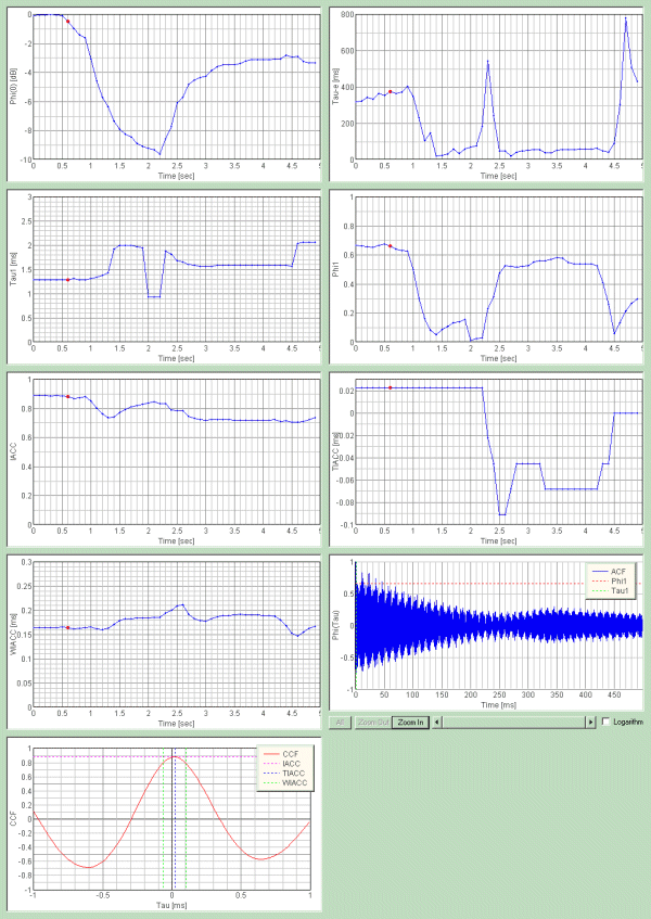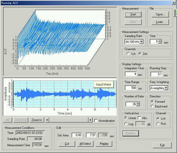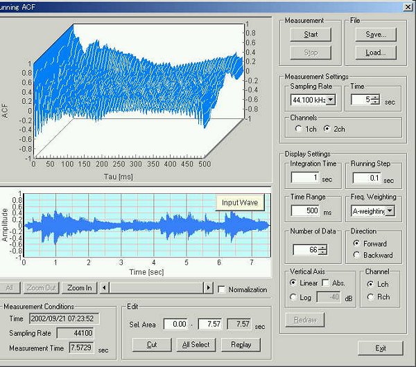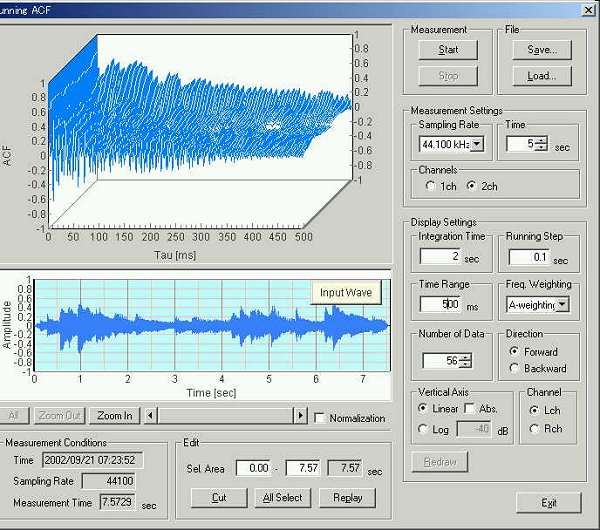 このシステムはアナログ波形に対するランニングACF分析での時間解析から、遅れ時間の最初のピークに着目し、両耳の信号の相互相関を時間解析することにより人間の脳をシミュレーションしています。音楽を聴くときは2秒の時間窓が適切であることを3次元表示は表しています。