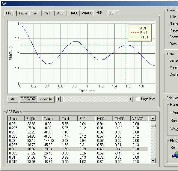 以下のACFの分析のほうは、同じ条件で、3.6msecの位置の277Hzの基本周波数表示をはじめとして、大方”あ”のフォルマントが確認できる。X軸方向0から3つを先頭からの3つのピークで1.5msecまでにあらわしています。次にX軸方向に拡大してその値を確認してみます。