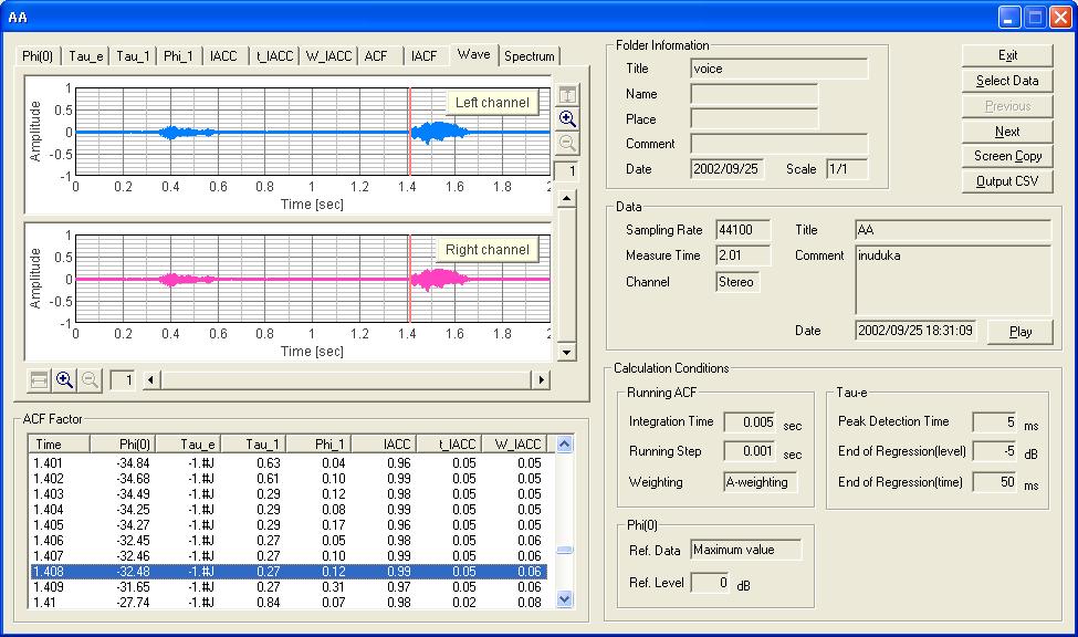The figure shows the temporal waveform of the data analyzed. In the graph, the portion between 1.408 and 1.413 s (5 ms) is selected.