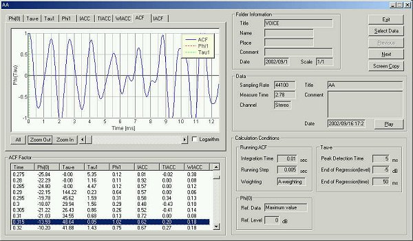 The lowest peak in the spectrum is called the first formant (F1), followed by the other formants F2, F3, and so on. In the ACF graph above, there are four peaks and valleys as follows. The peak at 1.61 ms is the first formant frequency (613 Hz ) in this stage, but its amplitude is small. Also the 769Hz component (peak at 1.3 ms) has shifted to 720Hz shortly after this. Considering these results, this ACF might represent the transient state of the utterance.
