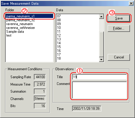 Click the "Save" button on the Impulse response window, then the "Save Measurement Data" dialog opens as below. To save data, 1) enter the title and comment on the data, 2) select the folder, and 3) click the "Save" button. If there is no folder, or you want to save data in a new folder, you can create a new folder. See below.
