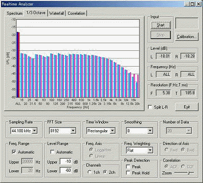 By using WAVE input/output functions, re-analysis and sharing of the data with other system becomes possible. For the high resolution analysis, just record a sound with low resolution and analysis it later. Simultaneous sound playback and measurement is also possible. For example, play the recorded sound and start the FFT analyzer. The power spectrum or the 1/3 octave band analysis is performed in real time. For this purpose, the multi task OS like Windows 2000 and XP are recommended.