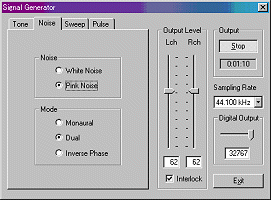 In most cases, the most problematic device is the analog amplifier built in the D/A converter. The 16 bit D/A converter transforms the amplitude of the digital signal (1-32767) to the analog signal. But this output signal is distorted in most PCs' sound chip around the maximum output level. To reduce such a distortion, digital volume should be adjusted. Digital volume is called as "Digital Output" in RA as shown in the signal generator.